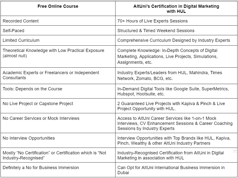Why settle for a mediocre digital marketing education when you can level up and get the real deal? Free online Digital Marketing courses may seem like a cost-effective solution, however, they lack a comprehensive curriculum, structured lessons, and experienced instructors of the AltUni Digital Marketing program. So, How does it differ? What are the benefits of taking up AltUni Digital Marketing Certification? Does it help you with interview opportunities?